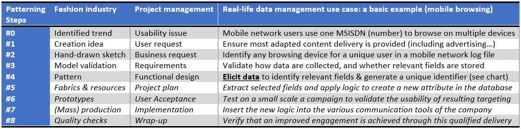 As this blog is aiming at a large public, I chose to keep a rather simple example. Of course, should the matter be more intricate, the skills I have built up over my years of experience in Data Management will even be more valuable. Feel free to ask more about patterning or other fields of Data Elicitation, I shall be glad to elaborate customized solutions for your business.